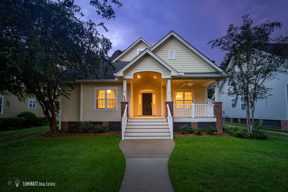 The home is slightly elevated and makes a grand impression with its large front porch and arched entryway to the front door.