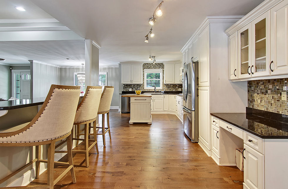 The living room is anchored by a large brick fireplace, trimmed and flanked by oversized built-ins. A long high bar separates the living room from the kitchen and provides flexible work, hosting, or dining space while keeping everyone together.