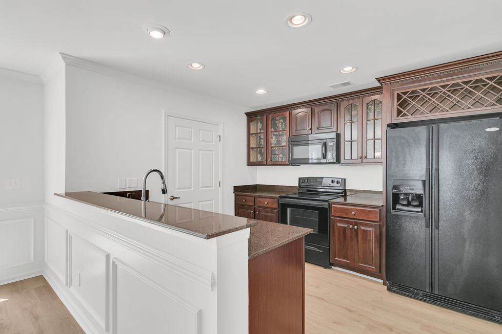 The kitchen sits just off the dining area and includes Silestone countertops, a high-top bar, tall upper cabinets with glass fronts, a built-in wine rack, and recessed lighting. All-electric appliances convey—including the stove/range, dishwasher, microwave, trash compactor, garbage disposal, and refrigerator. The kitchen also features a generous pantry/laundry closet that includes a full-size stacked washer and dryer.